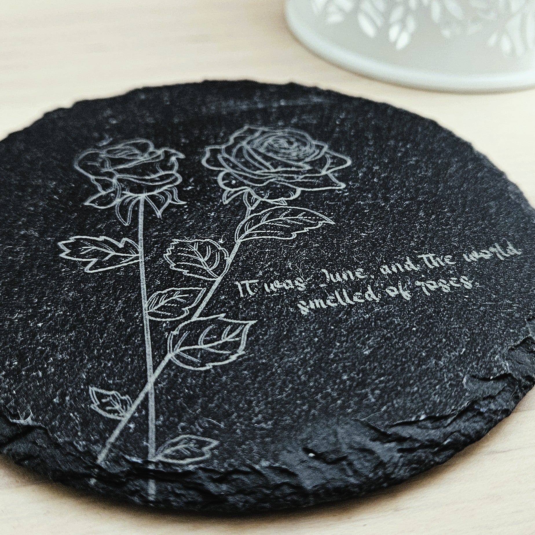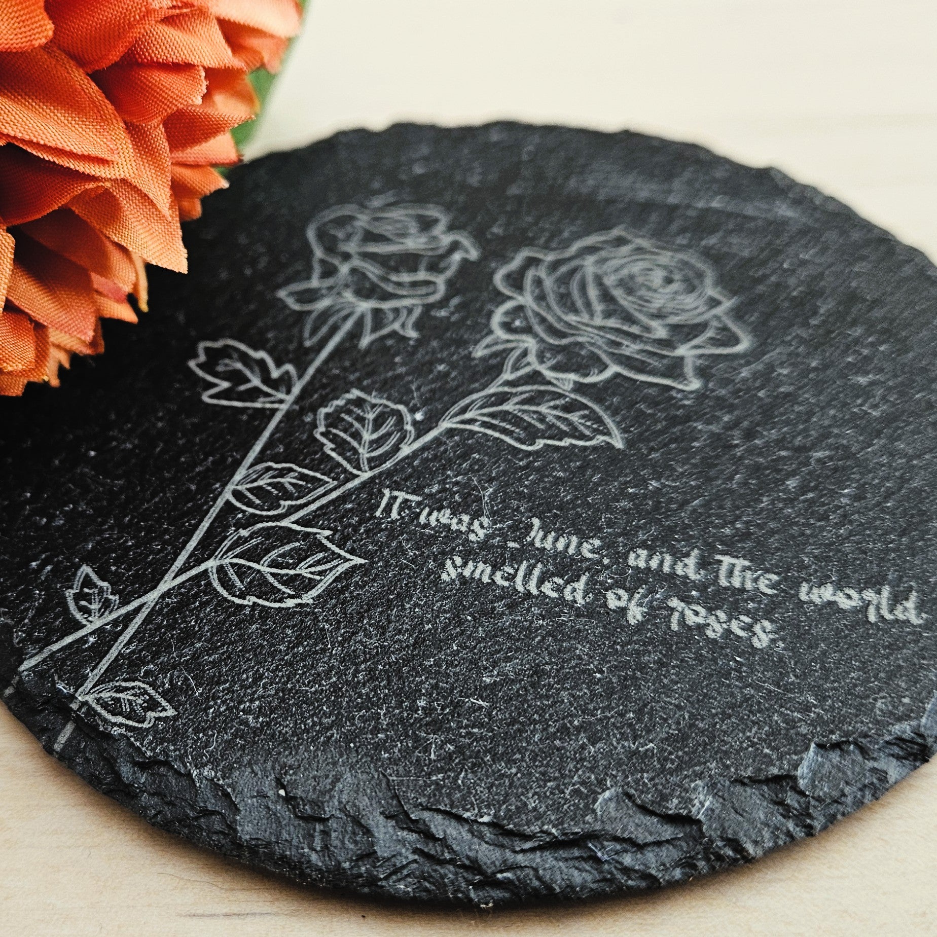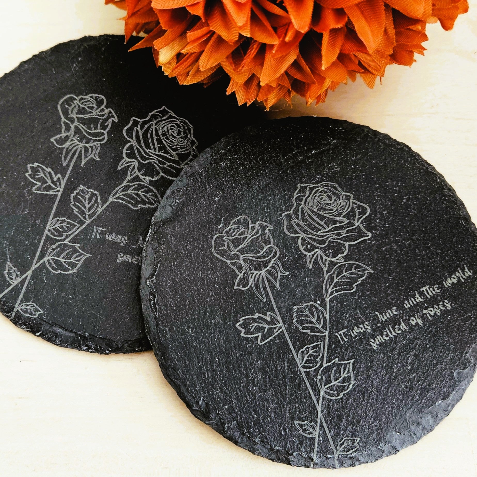 Elevate your home décor with our exquisite Birth Month Flower Slate Coasters. Each coaster is meticulously crafted from natural, genuine slate, providing a beautiful rustic backdrop for the delicate laser-etched design of your chosen birth month flower. Perfect for protecting surfaces from spills and rings, these unique coasters also feature a subtle, inspiring quote, making them a truly meaningful and durable gift for someone special.